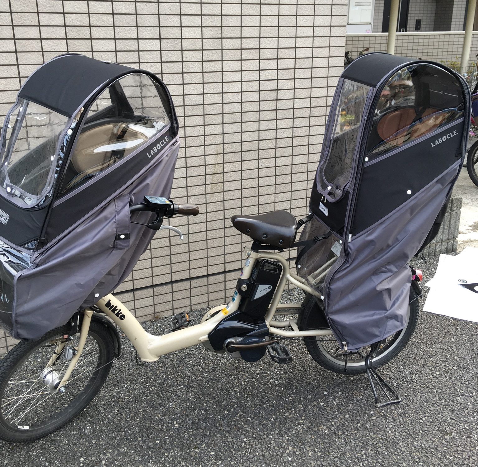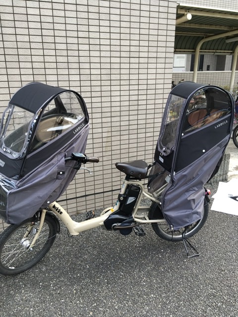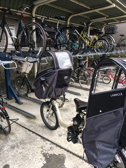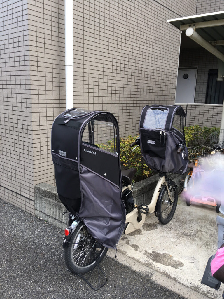 今回レインカバーのリサーチをするにあたって、幼稚園の駐輪場やスーパーの駐輪場、走行中の自転車、いろいろ目にしてきました。そんな中、「あれは自分好みではないな 」 、「古くなると汚く見えるな 」 、「良さそうだな 」 、とだんだん目が肥えてきたところで私が選んだのがLABOCLEのレインカバーです。